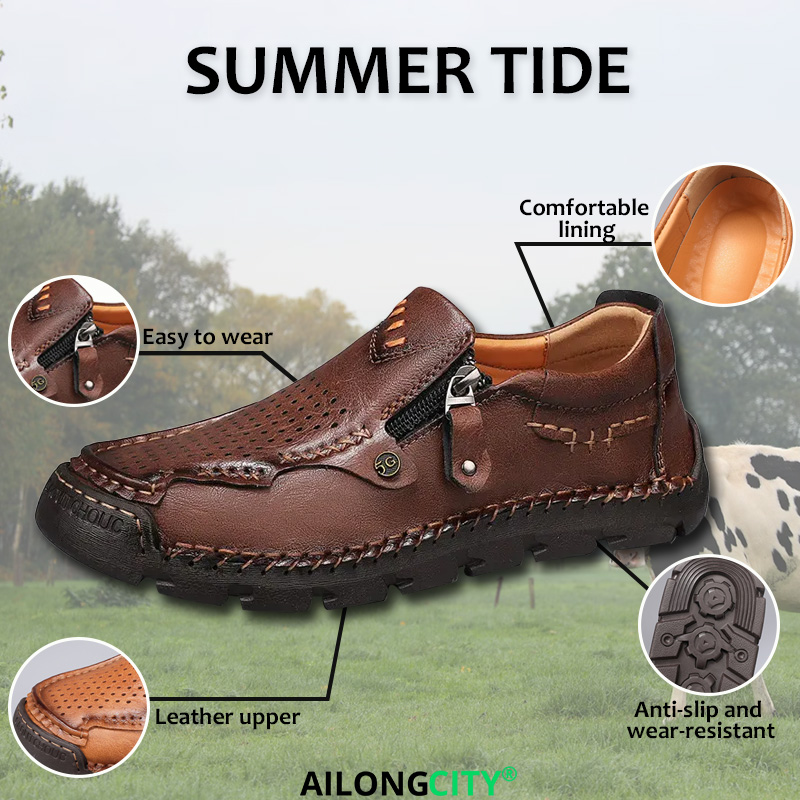 Brown Perforated Zippered - Ailongcity® Casual Leather Shoes Artisan Craftsmanship with Breathable Effortless Style
